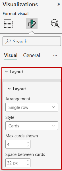 10. Use the Visual > Layout section to change the layout of the KPI cards row as needed, such as the maximum number of KPI cards, space between cards, and so on.