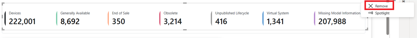 13. Click the three-dot menu button on the upper-right corner of the existing KPI cards row and then select Remove . This action removes the text box that is placed on top of the KPI cards. See the following image for an example.