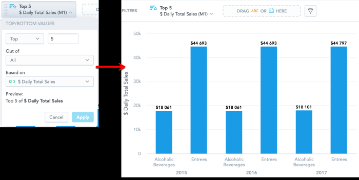 You want to see which are the top five menu categories that has sold best—select Top 5 out of All based on Daily Total Sales .