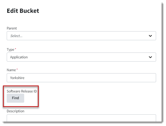 - On the Create Bucket or the Edit Bucket slideout, locate the Software Release ID field. (If necessary, refer to the instructions in Creating a Bucket or Editing a Bucket for accessing either slideout.)