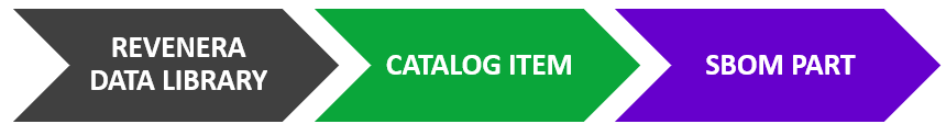• Catalog items are an abstraction of unique combinations of a component version, selected licenses, and associated security vulnerabilities. Catalog items are collected in the SBOM Catalog and shared across multiple SBOM parts.