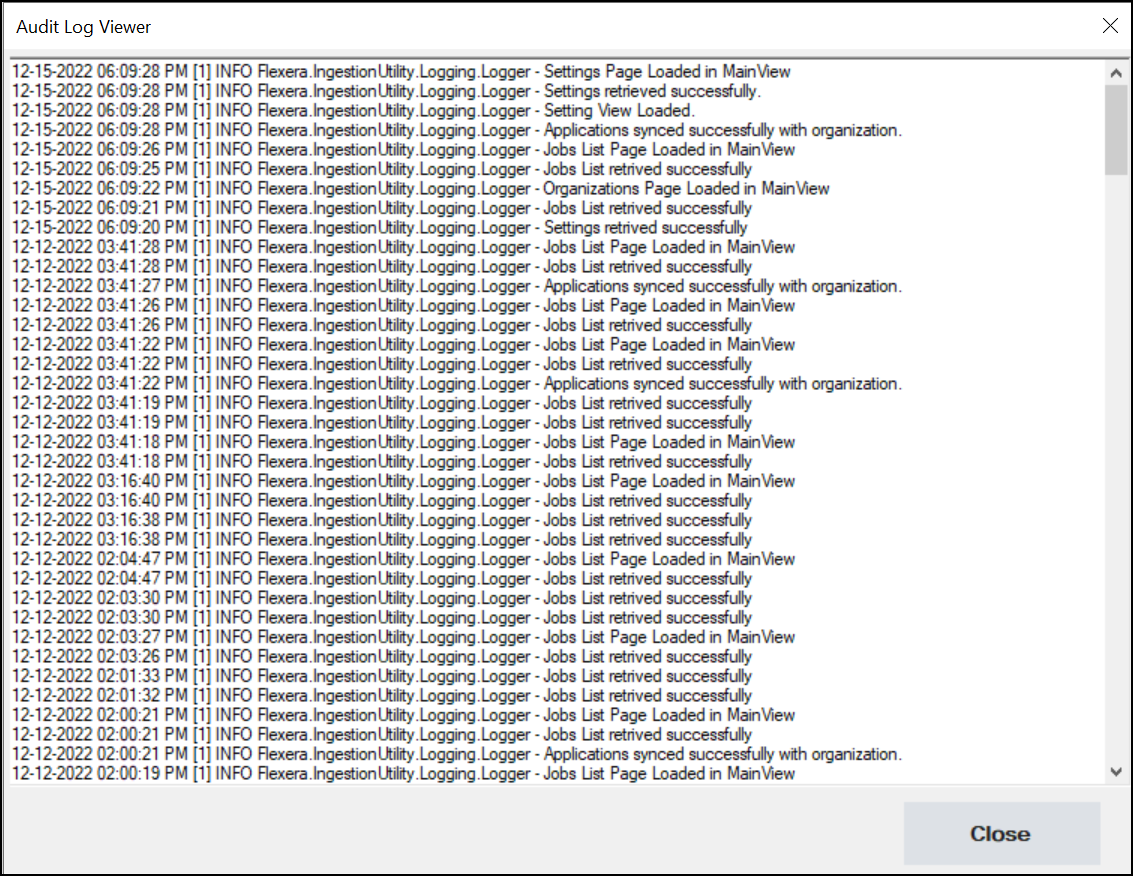 The path of the audit logs is C:\ProgramData\FlexeraIngestionUtility\Flexera_Log_Directory